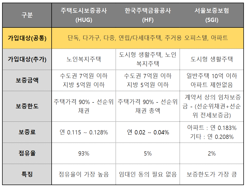 - 보증내용 : 전세계약 종료 후 임대인이 임차인에게 반환해야 하는 전세보증금의 반환을 책임